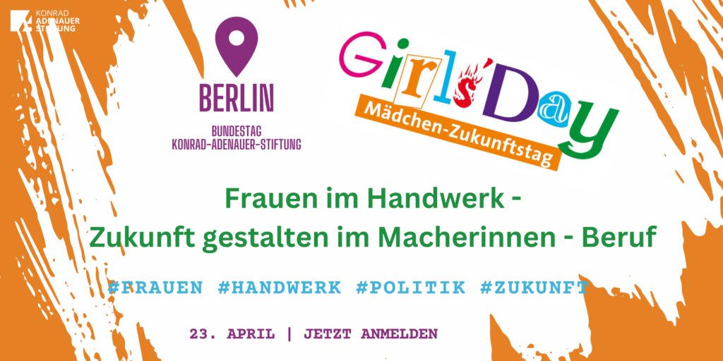 Gerade im Handwerk werden engagierte Frauen dringend gebraucht – mit neuen Ideen, Perspektiven und Mut zur Zukunft! Anmeldeschluss ist der 10. April 2026. Die Plätze sind begrenzt! Die Kosten für An- und Abreise sowie ggf. Übernachtung müssen selbst getragen werden. Alle Infos und zur Anmeldung: https://www.kas.de/de/web/berlin/veranstaltungen/detail/-/content/frauen-im-handwerk-zukunft-gestalten-im-macherinnen-beruf